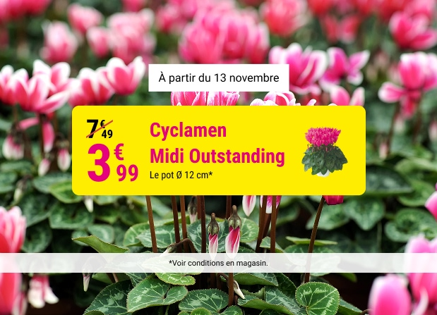 À partir du 13 novembre, le Cyclamen "Midi Outstanding" sont à 3.99€ au lieu de 7.49€.
